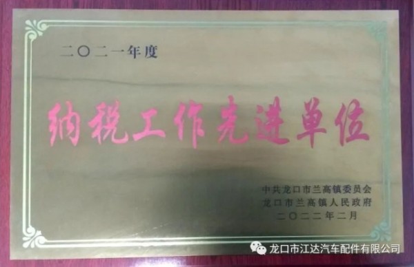 龍口市江達(dá)汽車(chē)配件有限公司 被授予納稅工作先進(jìn)單位