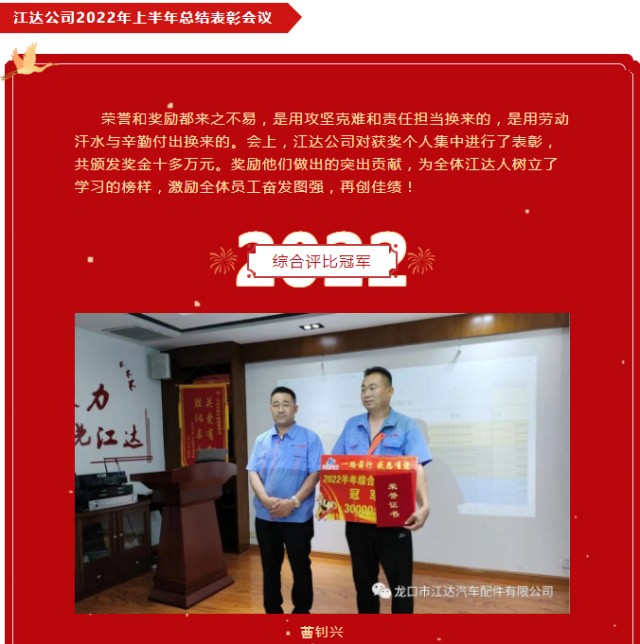 董事長(zhǎng)在總結(jié)中指出:2022年上半年,是十幾年以來不平凡的半年,訂單增加,原材料漲價(jià),在管理人員幾乎沒有增加的情況下,我們的產(chǎn)量翻倍增加,同時(shí)各個(gè)管理崗位工作量翻倍增加,在所有管理者的帶動(dòng)下,廣大員工齊心協(xié)力,奮勇拼搏,在超負(fù)荷的工作中,無怨無悔,勇于奉獻(xiàn),創(chuàng)造出一曲江達(dá)公司只爭(zhēng)朝夕、奮勇爭(zhēng)先的壯美凱歌。