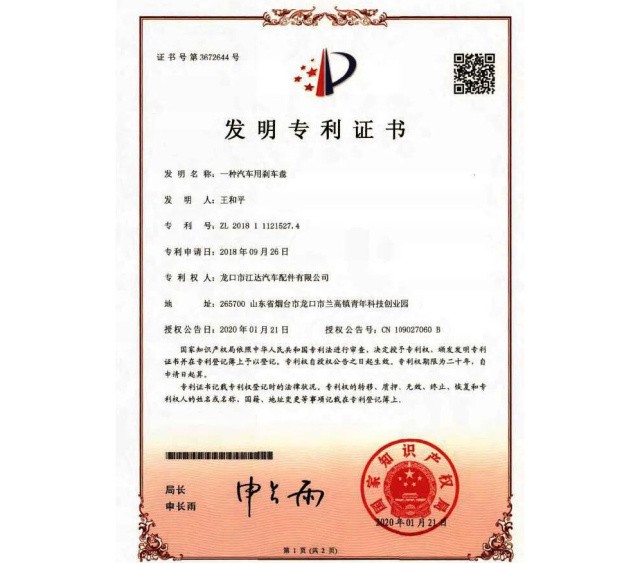 隨著江達(dá)公司向著高質(zhì)量方向不斷邁進(jìn)的同時(shí),在專利保護(hù)上,公司已申請(qǐng)國家發(fā)明專利8項(xiàng),實(shí)用新型專利23項(xiàng),對(duì)現(xiàn)有公司重要產(chǎn)品及設(shè)備進(jìn)行產(chǎn)權(quán)保護(hù)。其中,快速散熱高速剎車盤、高強(qiáng)度雙片剎車盤、高清潔式防腐制動(dòng)盤等重量級(jí)產(chǎn)品已獲得山東省企業(yè)技術(shù)創(chuàng)新獎(jiǎng)一等獎(jiǎng),企業(yè)及產(chǎn)品知名度不斷擴(kuò)大。