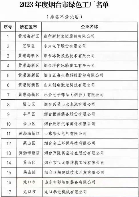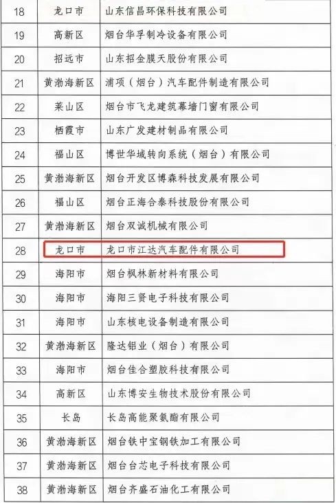 近日,煙臺(tái)市工信局下發(fā)《關(guān)于認(rèn)定2023年度煙臺(tái)市綠色工廠》的名單公告,龍口市江達(dá)汽車配件有限公司榜上有名,被認(rèn)定為“煙臺(tái)市綠色工廠”。