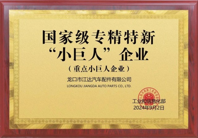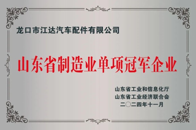2024年11月,江達(dá)汽配新能源特種車輛零部件項(xiàng)目經(jīng)過市級(jí)推薦申報(bào),山東省工業(yè)信息化廳將龍口市江達(dá)汽車配件有限公司列為山東省第八批制造業(yè)單項(xiàng)冠軍企業(yè)。